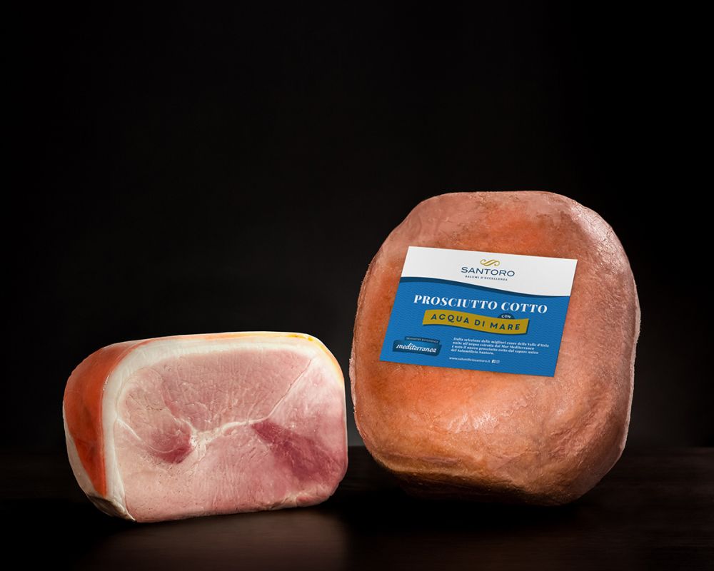 Lontani dal mare non si può stare, lo sappiamo bene. Da questa voglia di onde, dalle migliori cosce della Valle d’Itria e dall’acqua estratta direttamente dal Mar Mediterraneo nasce il nostro Prosciutto Cotto Artigianale all’Acqua di Mare. Salumificio Santoro incontra Mediterranea e la sua acqua con ben 78 minerali differenti per dare vita a un prosciutto cotto dal sapore unico e dal gusto equilibrato e intenso.